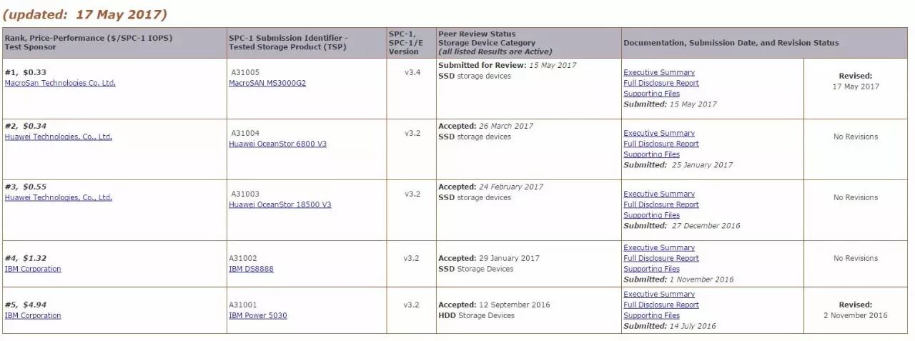 43万IOPS、0.33美元/SPC-1IOPS是一个什么概念?在业界进行横向对比是一个什么水平?为此,我也查阅了SPC-1官方网站(http://www.storageperformance.org/results/results_spc1_v3/spc1_v3_top-ten)。