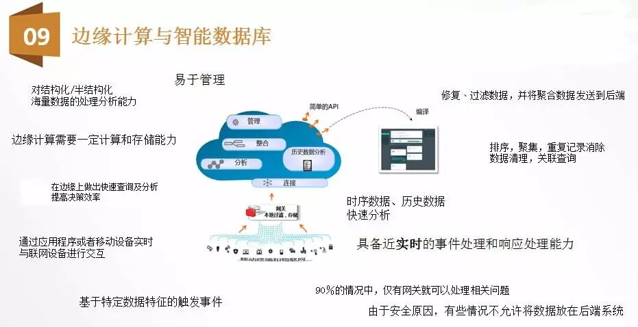 根据测算,90%的情况下,网管设备计算能力除了可以满足业务处理的需要以外,还有富余的空间。所谓边缘计算,就是可以充分利用这些设备的计算能力在本地对数据进行修复、过滤等梳理,并将聚合后的数据发送到后端的数据中心。这就是边缘计算的思想,不仅可以充分利用这些设备的计算能力, 也可以用于节省宝贵的带宽资源, 并体现机器大数据的价值。