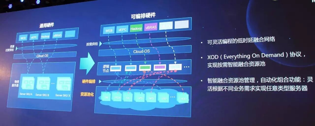 在传统企业应用之外,更能体现华为服务器技术创新的是其针对数据中心云原生基础设施平台,其最大特点增加了硬件编排层软件,它可以根据不同云原生应用,如Web、vEPC、Hadoop、vBRAS对于CPU、GPU、存储、网络的不同需要,按照资源池供给资源。据介绍,该硬件编排层软件对上支持虚拟化、OpenStack等,并不会造成客户锁定。