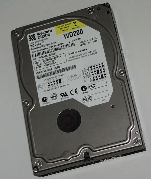 图3 所示的WD200BB硬盘是3.5英寸的普通IDE硬盘,它是属于比较常见的产品,也是用户最经常接触的。除此,硬盘还有许多种类,例如老式的普通IDE硬盘是5.25英寸,高度有半高型和全高型。除此,还有体积小巧玲珑的笔记本电脑,块头巨大的高端SCSI硬盘及非常特殊的微型硬盘。