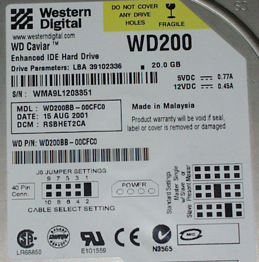 此次,笔者非常有幸从西部数据(WesternDigital)公司哪拿到了一块最新硬盘,产品型号为WD200BB,如图3、4 所示。从型号上可以判断,它是一款容量为20GB的7200RPM高速硬盘,产品序列号为 WMA9L1203351,产地为马来西亚,出厂日期是2001年8月15日。在接下来的说明中,笔者就以此块硬盘为例进行深入解剖及说明。