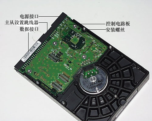 在硬盘的正面都贴有硬盘的标签,标签上一般都标注着与硬盘相关的信息,例如产品型号、产地、出厂日期、产品序列号等,图4 所示的就是WD200BB的产品标签。在硬盘的一端有电源接口插座、主从设置跳线器和数据线接口插座,而硬盘的背面则是控制电路板。从图5 中可以清楚地看出各部件的位置。总得来说,硬盘外部结构可以分成如下几个部份: