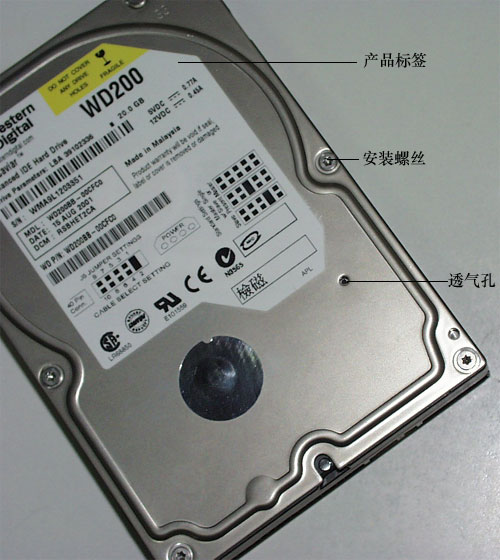 (3)、固定面板。就是硬盘正面的面板,它与底板结合成一个密封的整体,保证了硬盘盘片和机构的稳定运行。在面板上最显眼的莫过于产品标签,上面印着产品型号、产品序列号、产品、生产日期等信息,这在上面已提到了。除此,还有一个透气孔,它的作用就是使硬盘内部气压与大气气压保持一致。