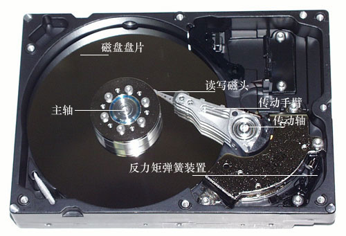 硬盘内部结构由固定面板、控制电路和板、磁头、盘片、主轴、电机、接口及其它附件组成,其中磁头盘片组件是构成硬盘的核心,它封装在硬盘的净化腔体内,包括有浮动磁头组件、磁头驱动机构、盘片、主轴驱动装置及前置读写控制电路这几个部份。