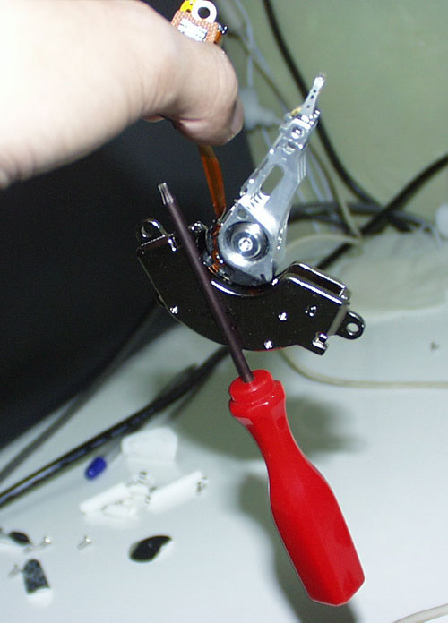 其中电磁线圈电机包含着一块永久磁铁,这是磁头驱动机构对传动手臂起作用的关键,如图10所示,磁铁的吸引力足起吸住并吊起拆硬盘使用的螺丝刀。防震动装置在老硬盘中没有,它的作用是当硬盘受动强裂震动时,对磁头及盘片起到一定的保护使用,以避免磁头将盘片刮伤等情况的发生。这也是为什么旧硬盘的防震能力比现在新硬秀盘差多的缘故。
