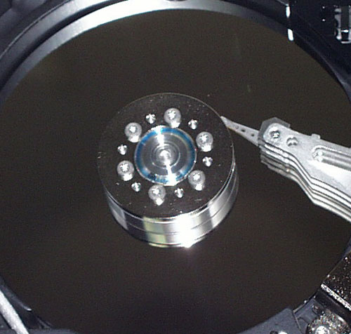 (3)、磁盘片。盘片是硬盘存储数据的载体,现在硬盘盘片大多采用金属薄膜材料,这种金属薄膜较软盘的不连续颗粒载体具有更高的存储密度、高剩磁及高矫顽力等优点。另外,IBM还有一种被称为“玻璃盘片”的材料作为盘片基质,玻璃盘片比普通盘片在运行时具有更好的稳定性。从图11中可以发现,硬盘盘片是完全平整的,简直可以当镜子使用。