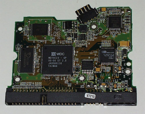 (2)、控制电路板。大多数的控制电路板都采用贴片式焊接,它包括主轴调速电路、磁头驱动与伺服定位电路、读写电路、控制与接口电路等。在电路板上还有一块ROM芯片,里面固化的程序可以进行硬盘的初始化,执行加电和启动主轴电机,加电初始寻道、定位以及故障检测等。在电路板上还安装有容量不等的高速数据缓存芯片,在此块硬盘内结合有2MB的高速缓存。