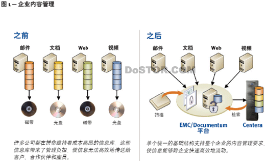 EMC Documentum通过提供了一组集成的内容服务,首先,可以使企业的信息具有更多智能,帮助企业对非结构化数据信息提供管理,从创建到存档直到销毁。与其他解决方案不同的是,EMC Documentum在统一的停息基础架构中对所有内容类型进行管理。其次,可以精简企业协作型流程,使各种结构化和非结构化的信息,同时在一套解决方案中实现协作和业务流程的统一,从而可以有效保证企业的信息资产的保护和利用,带来企业成本的减少和效益的提高。
