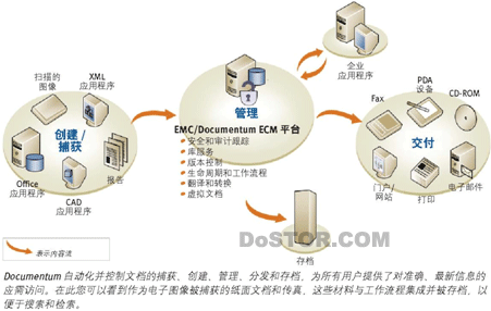 EMC Documentum Content Server 管理Documentum 内容存储库,并支持一套丰富的内容管理服务,用于控制全部分布式企业中的内容和过程。 EMC Documentum 业务流程管理提供用于在人和系统之间自动化并优化业务流程的功能全面的能力。EMC Captiva 在信息存储到EMC Documentum 内容存储库中之前提供高容量的文档捕获和索引。EMC Acartus 支持从任何业界标准的打印流格式中捕获计算机生成的报告并建立索引,以及旧式COLD 系统中的报告的卷迁移。