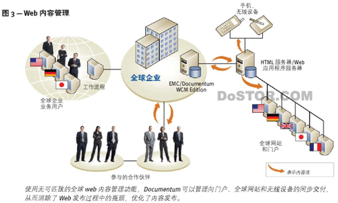 随着EMC Documentum 产品在Web 内容管理(WCM) 中的应用,各公司将能够消除Web 发布过程中的瓶颈,从而充分利用Internet 分发渠道的全部潜力。(参见图3) EMC Documentum Web Publisher 使公司用户能够将内容发送到Web ,并使超级用户能够自动化复杂的发布工作。 EMC Documentum Site Delivery Services(EMC Documentum 站点提供服务)自动化了向全球Web 场和服务器的内容提供。
