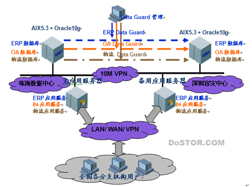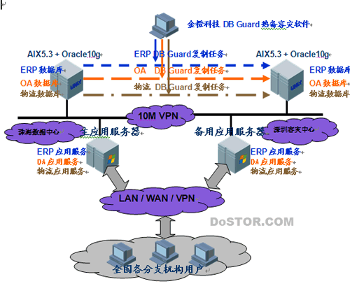 网络:主备机之间是10M VPN,两地的应用服务器与数据库服务器接在同一交换机,终端用户通过VPN、LAN、WAN 访问应用服务器;