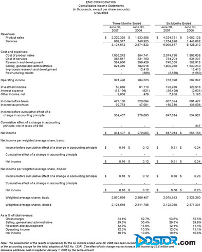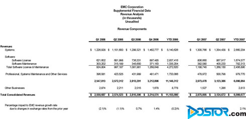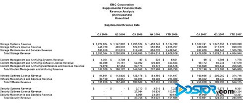 细观整个财报,EMC的季度销售收入已经达到了31.2亿美元,与去年同期一样保持了两位数的增长,同时,这已经是EMC连续第16个季度保持两位数增长了,而且这个数值也超过了此前分析人士预估的EMC季度销售收入五千万美元,据审计机构表示,EMC2007年第二季度经过GAAP审计后的净收益为3.344亿美元,合每股摊薄收益0.16美元,比去年同期的0.12美元增长了33%。虽然此次公布的全年销售额为127亿美元,并带来了超过64美分的每股分红,但是比同期的127.8亿美元销售额和每股68美分的分红要少一些。