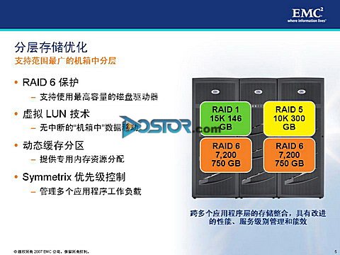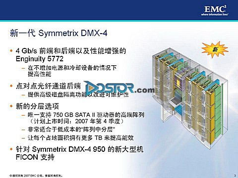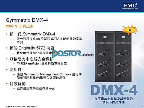 DoSTOR存储分析8月7日消息:近日EMC发布了其最新企业级存储平台Symmetrix DMX-4,以及性能增强了的操作系统环境Enginuity 5772。新的Symmetrix拥有三个关键特性:全新的后端体系结构,有力的分层能力,以及入门级大型机支持。全新设计的点到点后端设置有助于客户避免磁盘故障,这将有效的提高可靠性及可维护性。