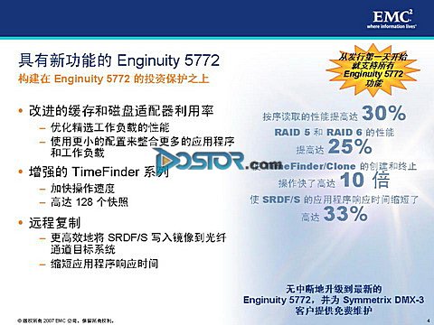下面是EMC官方披露的Symmetrix DMX-4和Enginuity 5772的详情,在这里您可以先睹为快,了解EMC此次产品更新的更多细节与特性。在此我们感谢我们DoSTOR的忠实用户cnpmc 帮助我们获得了如此详细的信息。更多信息可参见《DoSTOR存储分析 DMX-4发布 增强企业级存储性能》