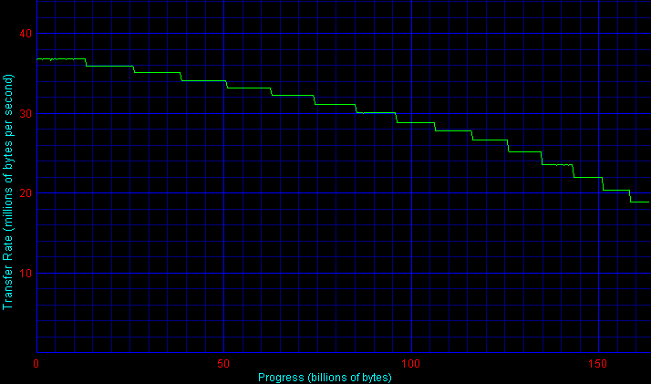 连续(STR)数据传输率和突发数据传输率(Burst TR),也是顾名思义,突发数据传输率就是硬盘在突发情况下所能达到的数据传输率,它一般略低于硬盘接口带宽,由于它是一种突发状态下产生的数据传输率,所以它并不能准确表示硬盘的速度快慢,但STR连续数据传输率刚好与其相反,它是表示硬盘速度快慢最真实的体现。STR并不是硬盘所有时刻数据传输率值的平均值,而是磁头由盘片内圈至外圈连续寻道时的数据传输率,利用业内知名的WINBENCH实测得到的硬盘STR图就可以清晰地看到这点,如图1所示。