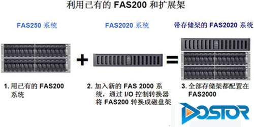 如果我们去看看NetApp的产品,NetApp的一个与众不同之处就在于:由于各系列产品都是自主研发,所以秉承了同样的硬件控制器并运行相同的DataONTAP操作系统。比如V系列和FAS系列硬件控制器和操作系统就是一致的。这样做的好处有很多,最突出的一个就是便于升级。比如FAS200升级到FAS2000, 只需要将FAS200的原有控制器升级为FAS2000的控制器即可完成升级。对于企业来说,这样不仅节约了新的硬件投资,还保护了原有投资,最关键的是避免了停机和丢失数据的风险;对于IT管理员来说,相同的操作系统、硬件控制器和操作界面,让他们省掉了学习新设备操作的时间和精力,也是提高了工作效率。下图所示就是FAS200升级到2000的示意图