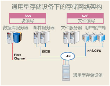 统一存储论道(一):过去SAN与NAS,或是FC SAN与IP SAN之间,彼此总是泾渭分明,企业必须为不同型态的应用分别建设存储设备,而通用型存储设备可同时支持不同的传输协议,从而以单一系统满足企业各式各样的存储需求,有效解决传统存储系统不够经济与管理困难的问题。