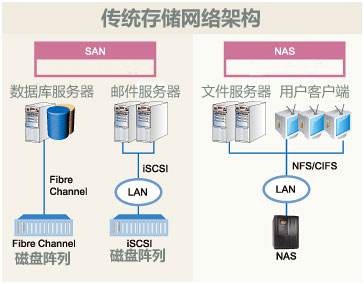 过去的SAN多半是以价格高昂的光纤通道(FC)作为基础,受限于光纤通道交换器与HBA卡的价格,只能让少数关键应用的主机或服务器接上SAN。后来出现了以IP网络为基础的IP SAN技术,可在现有的IP网络上进行区块读写,任何服务器只要装上以太网络卡就能接上IP SAN,因此可将SAN的应用范围扩展到一般非关键应用的服务器上,让过去受限于本地端存储设备的服务器也能享受到存储区域网络的优点。
