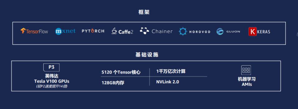 AWS不仅有这样的“半成品”,用户也可以借助AWS Sagemaker平台,让行业企业的开发者,用自己熟悉的算法获得机器学习的能力。Sagemaker提供TensorFlow、Caffe等标准化的框架以及基础硬件平台,如英伟达的P3。