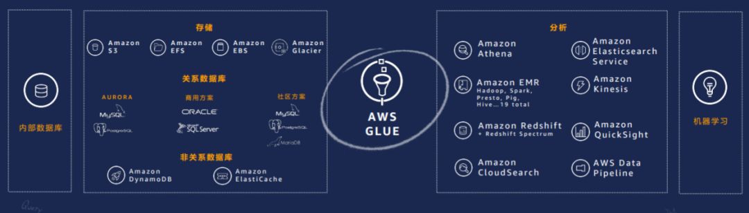 为了满足数据分析的需要,AWS Glues实现了数据源、数据湖和分析应用系统的连接,用户可以应用到几十种AWS不同类别的应用,从而来搭建自己的数据分析的平台。