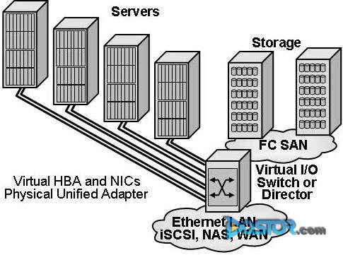 在一个传统的物理服务器上,即使只有一个物理适配器,如一个InfiniBand主机通道适配器,当它被插在一个PCI或PCIe槽上时,操作系统也会看到一个或更多个光纤通道适配器或以太网适配器。如果是一个虚拟化的服务器,如VMware ESX,虚拟机管理程序可以只看到并共享一个物理适配器,或多个适配器以供冗余和性能之需,而Guest Operation System会看到的将是一个标准的光纤通道或以太网适配器或是一个使用标准的插口和驱动程序的网络接口卡。