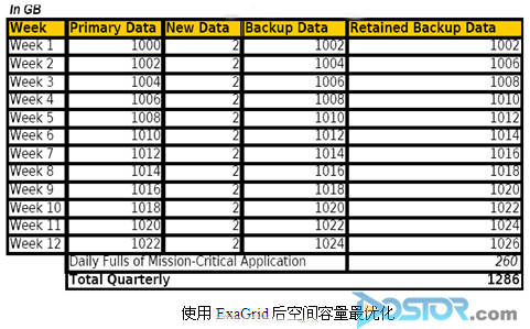 使用ExaGrid,同样的备份过程会产生非常不同的结果。第一次全部备份会产生1TB多一点的备份数据,这与传统方法产生的结果相同。然而,当执行更多的全部备份后,数据增长率就远远低于传统解决方案了。一个季度后,所有的数据总量只有1.28TB,而传统D2D备份方案则有19.3TB的数据总量。