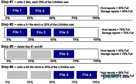 在接下来的说明中,您需要参阅图 1。以分配给主机的新 LUN 为例。在步骤 1 中,我们写了两个新文件,每个占 LUN 25% 的空间。主机和存储都报告使用了 50% 的空间,这在意料之中。如果我们增加同样大小的第三个文件(步骤 2),主机和存储汇报的利用率又都一样。