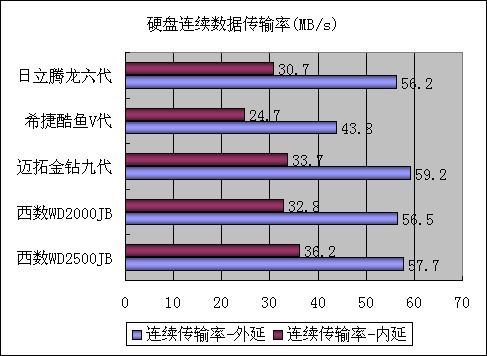 可以看出,WD2500JB的外部传输率达到了57.7MB/s,可以说这个成绩还是相当不错的。但是这个相对于原来推出的硬盘的提高,也只能是说明了由于2500JB系列的单碟容量提高的结果。传输速率也是慢慢地下降,最后,实测得内延连续数据传输率为36.2MB/s。