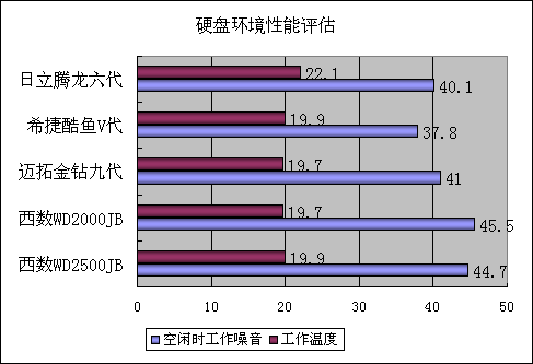 虽然WD2500JB相对那些采用了液态轴承等新技术的硬盘来说,用的是传统的滚轴,但是其工作噪音却还是在我们可以明显感到的45分贝以下。可以说,这个噪音对于整个系统的噪音来说还是不大的。