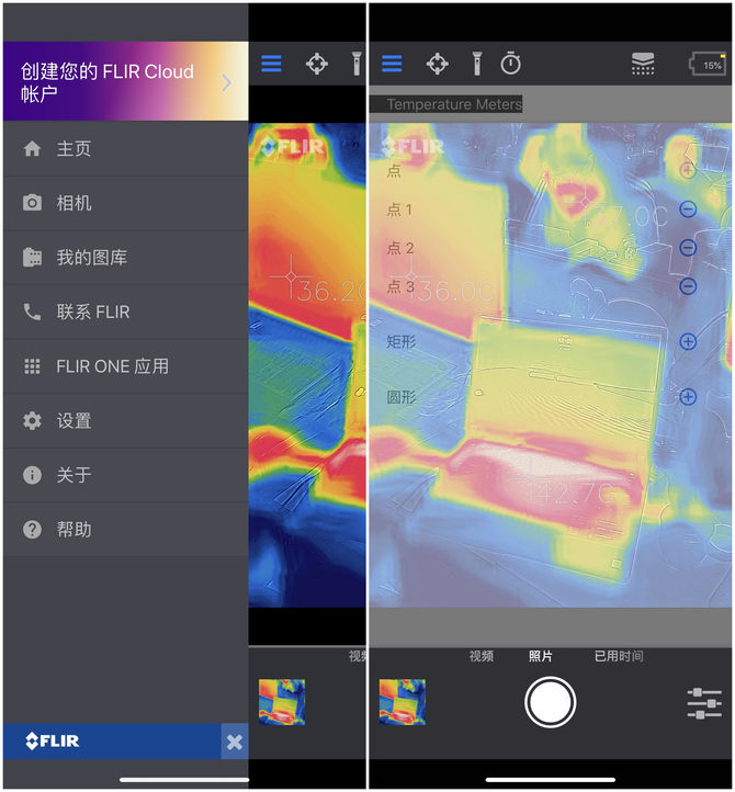 FLIR ONE左侧侧拉菜单、以及点测温和感兴趣区域温度体验界面