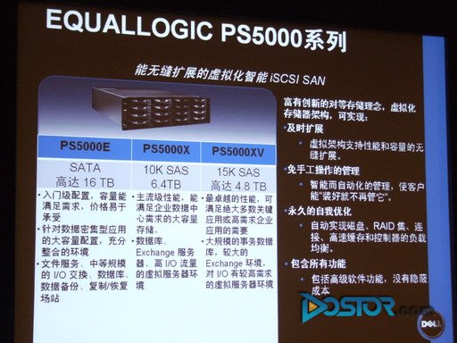 DoSTOR存储专访:在宣布完成对EqualLogic收购之后不到一个月,戴尔公司几乎是有些迫不及待的推出了首款冠以Dell EqualLogic品牌的存储产品–2月25日,戴尔公司在北京正式宣布,推出面向全球推出新一代iSCSI存储局域网络(SAN)阵列–Dell EqualLogic PS5000系列,这也就意味着,从此以后,在戴尔公司的存储产品线中将诞生一个全新的产品系列:Dell EqualLogic,而这个系列的存储设备在未来,或许将会成为戴尔简化存储,乃至简化IT的关键一环。