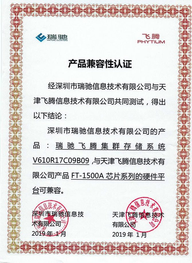 此外,经过双方的共同努力,攻克层层技术难关,产品通过兼容性认证测试。瑞驰飞腾集群存储系统V610R17C09B09与天津飞腾FT-1500A芯片系列的硬件平台可兼容,这为双方长期合作奠定了更加坚实的基础。