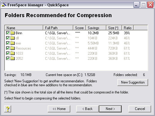 FreeSpace可以对硬盘维护和压缩,但是和普通的压缩软件最大的不同就是经过它压缩的文件,不仅在个头上要小了许多,而且不影响软件的正常使用,并且由于一些文件的源代码被压缩,所以在使用的时候速度不但没有下降,反而会有所提升,这也就是称之为动态硬盘压缩专家的原因了。
