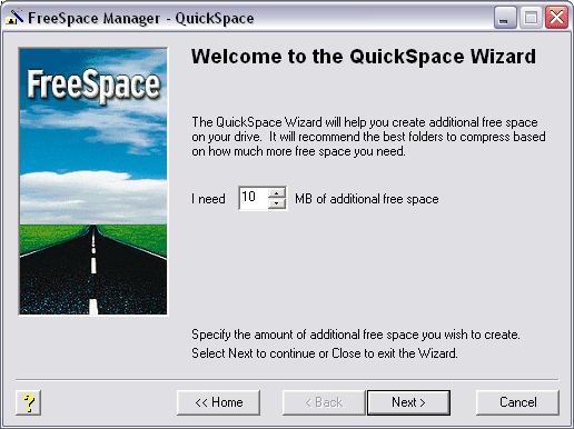 1、QuickSpace(快速压缩) 既然是快速压缩,那就是整个压缩操作中最简单的一步了,只需在图5-5-62的界面中键入想要释放的硬盘空间大小并选取相应的硬盘分区,最后点击“Next”,几秒钟之后,你的硬盘就会多出许多可用空间了。但是要提醒大家注意一点,如果超过了分析器中可以释放的空间数量,那就会产生错误。