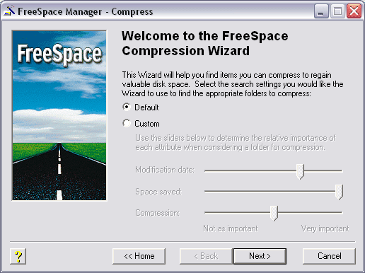 所谓压缩优化,就是将硬盘中的一些文件进行打包压缩,这样可以减少占用的硬盘空间,一般来说,它只适合于小容量硬盘用户,如果你用的硬盘是60GB以上的超大硬盘,应该就不需要再考虑所谓压缩优化问题了。我们经常使用的压缩软件有Winzip、WinRAR等,这类压缩工具一般只适合于压缩存档,如果想对硬盘进行动态压缩,,笔者推荐FreeSpace(下载网址:http://nj.onlinedown.net/FREESPACE.HTM )。