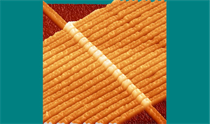 图片:原子力显微镜下的一个有17个忆阻器排列成一排的简单电路的图像。每个忆阻器有一个底部的导线与器件的一边接触,一个顶部的导线与另一边接触。这些器件起"记忆寄存器(memory registors)"的作用,每个器件的电阻取决于通过每个器件上的电荷数量。这幅图中的这些导线是50nm宽,或总共大约150个原子宽。图片由J. J. Yang, HP Labs许可。