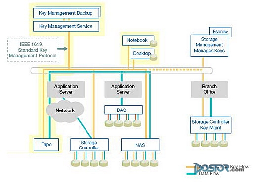 国际电气电子工程师协会正积极筹划制定的IEEE 1619静态数据安全标准,就是针对磁盘存储系统缺乏统一标准, 各个厂家的产品无法互操作,密匙管理机制参差不齐,以及难以实现对企业海量数据长期安全存储的要求而提出的。下图就是基于IEEE 1619.3 标准的磁盘加密系统结构图。