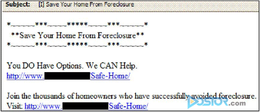 一些垃圾邮件发送者试图利用避免赎回权被取消的补救措施来"帮助"业主减轻抵押贷款义务以及避免信用等级受损的负面影响。下例中,垃圾邮件发送者要求终端用户访问一个网站并在表格中填写邮寄地址、电话、抵押贷款余额等信息。用户点击提交按钮后,会出现确认消息,注明他们的代表会就贷款问题与用户取得联系。