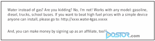 低迷的房地产市场并非垃圾邮件的唯一的目标。随着燃料价格的上涨,赛门铁克观察到与汽油/燃料相关的垃圾邮件数量激增。比如,这些邮件声称提供免费的汽油或汽油充值卡和产品,可以实现每加仑行驶更远的距离,从而降低总体的汽油消费。在新近的例子中,垃圾邮件发送者声称只要拥有一个特殊的装置,收件人可以使用水替代汽油作为车辆的燃料,以对抗高油价压力。