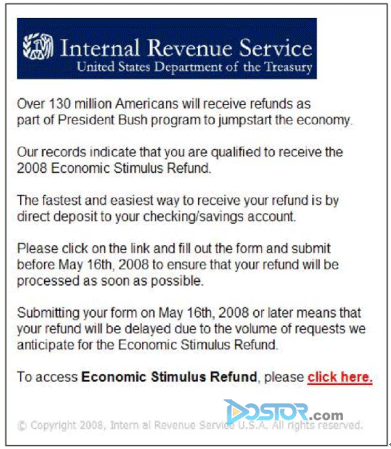 过去几个月中,美国政府的经济刺激方案覆盖范围越来越广,由此,赛门铁克也观察到一些垃圾邮件发送者向纳税人发送有关刺激性方案的钓鱼攻击邮件,其中包含刺激性方案的简要介绍(与美国国税局邮件的措辞十分类似)。之后垃圾邮件发送者会请求收件人提交个人信息。邮件中会特别强调如果用户不在规定期限内提交个人信息,退税就会被延迟。