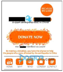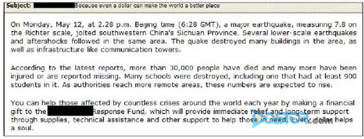 最近的地震捐款邮件骗局要求人们为中国地震受难者捐款。设计者在合法网站的根域下面插入一个欺诈性页面。用户只要点击垃圾信息中包含的网址,就会进入一个欺诈性网站并被要求捐款。