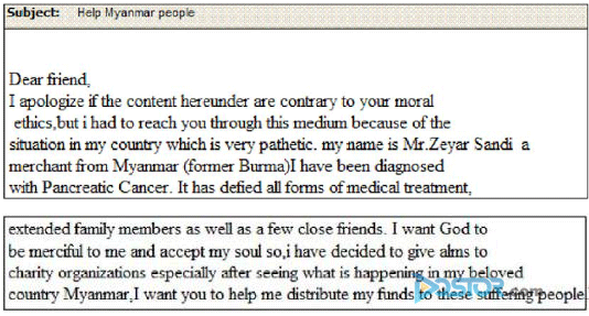 缅甸飓风也引起了垃圾邮件发送者的高度重视。飓风袭击4、5天后出现了类似于419垃圾邮件的慈善垃圾邮件。正如典型的419垃圾邮件风格,垃圾邮件发送者请求收件人帮助将捐款分发给飓风受难者,以减轻他的心理负担。