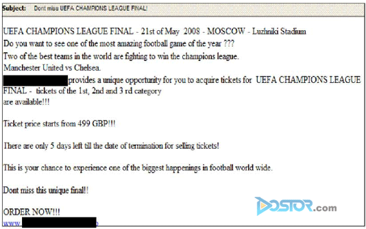 当收件人通过合法在线支付网站支付门票后,垃圾邮件发送者要求他们通过电子邮件发送姓名以及唯一在线付款凭单编号来获得门票。而欧洲足球冠军联赛决赛的合法在线支付网站警告客户绝对不要通过电子邮件发送在线付款凭单编号,而且只限于在接受付款的安全网站上使用该编号。