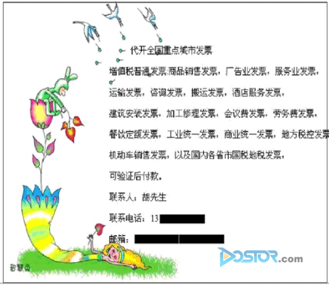 以逃税为目的的非法发票是中文中最常见的垃圾邮件之一。中华人民共和国公安部的一份声明显示,2007年中国警方破获发行或销售假发票的案件2963起,拘留嫌疑人1917人,没收假发票1051万张,捣毁假发票印制操作101次。