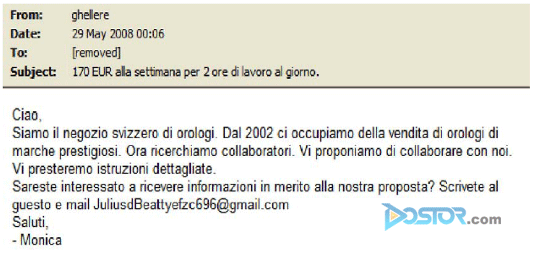尽管赛门铁克2月垃圾邮件报告中已经指出上述邮件,但这一类型的攻击在意大利却越演越烈。下面的例子中,该邮件自称来自瑞士某销售"著名"品牌手表的厂商。看到邮件中错误连篇的意大利语,以及毫不专业的电子邮件地址,你可能会怀疑怎么会有人上当。不过,鉴于这种攻击越来越受垃圾邮件发送者的青睐,很明显一些收件人还是受到了诱惑。