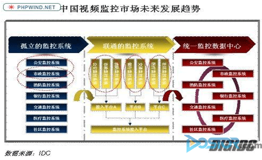从上面IDC的图示可以清晰的看出,监控市场正在从孤立的监控系统朝着联通化、统一化的趋势发展,随着监控市场的这种变化,管理的统一化、数据存储的集中化都在面临着更大挑战。目前统一管理已经得到相对较好的解决,只是各个运营商、厂商的平台还没有统一的标准,两个不同平台的监控系统要实现集中的管理还是有一定难度,但相信随着监控标准化的到来,这个问题会很快得到解决。至于存储数据的集中化由于目前受网络带宽的影响,还存在着一定的难度,如果全部铺设光纤线路,成本又相对较高,所以目前通行的做法是统一管理、分散存储。