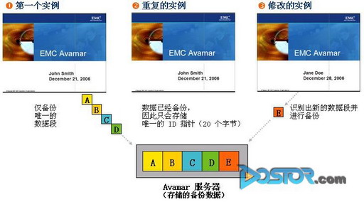 EMC能够根据客户的不同需求,提供三种重复数据删除技术。一是对象级的重复数据删除。在EMC Centera归档平台中,因为要满足法规遵从,EMC提供文件级(也叫对象级)的重复数据删除,将一个文件视为一个对象,当一个对象又被再次存储时,它不会存两份同样的数据,只是返回一个指针,并提示这个数据已经存在。但只有两个文件一模一样,它才会只存一次。如果文件哪怕有微小的变化,它就要存两次。二是Avamar重复数据删除技术,它是变长块的源端重复数据删除,删除率达到300:1,500:1,甚至更高。三是EMC虚拟磁带库(EMC Disk Library,EDL)。EDL跟Avamar是一个互补,Avamar是在源端进行重复数据删除,EDL是在后端(目标端)进行重复数据删除。