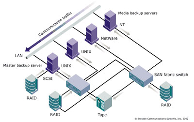 SAN将上述两种方法的优点结合到一起,它的做法是:对备份和恢复进行集中式管理,将一到多台磁带设备分配给每个服务器,使用FC协议将数据直接从磁盘设备传递给磁带设备。![]()