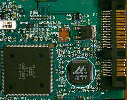 揭开酷鱼SATA V硬盘的后盖,我们发现其硬盘控制芯片型号和先前发布的酷鱼ATA V略有不同(估计针对Serial ATA做了一些改进),不过这并不意味着这是一个“纯粹”的Serial ATA硬盘,因此到目前为止,还没有完全支持Serial ATA接口的硬盘控制芯片,而酷鱼SATA V依旧是通过控制芯片旁边一颗型号为LSI L2A2219的芯片来实现对Serial ATA的支持。换句话说,现阶段的Native Serial ATA硬盘只是将原来的Serial ATA桥接器集成到PCBA上而已,还算不上绝对的Serial ATA方案。要进一步提高效率,或许要等到单芯片的Serial ATA硬盘控制芯片的出现。