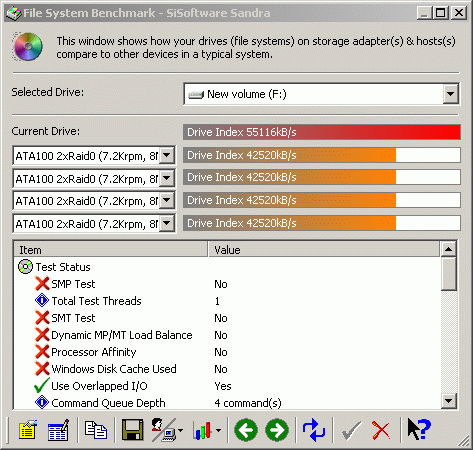另外,由Serial ATA酷鱼V组建的RAID 0系统中,磁盘速度和性能都得到了大幅提升,硬盘外延STR达到了87.4MB/s,这几乎是单块酷鱼V外延传输率的两倍,而内延STR也达到了49.4MB/s。在磁盘性能方面,SATA RAID0系统相对于单SATA硬盘也有了质的飞跃,从Sisoft Sandra 2003的文件系统评测结果来看,RAID0的性能也接近于单块SATA酷鱼V的双倍。